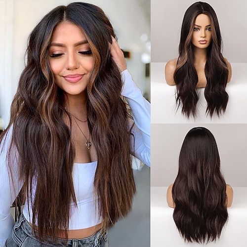Damen lange lockige Perücke natürliche brünette Perücken Mittelteil hitzebeständige Synthetik Weihnachtsparty-Perücken