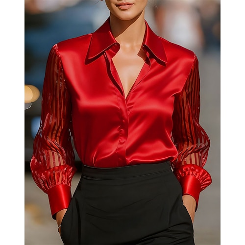 Per donna Camicia Elegant Raso/Satin Blusa Tinta unica Semplice Elegante Vintage Quotidiano Manica Lunga Colletto a Camicia Top Regolari Quotidiano Lavoro Ferie Arricciato Pizzo Patchwork Nero Bianco