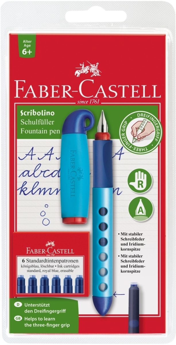 FABER CASTELL Schreiblernfüller für Rechtshänder Feder A inkl. Patronen auf Blisterkarte blau-brombeer Packung mit 5 Stück