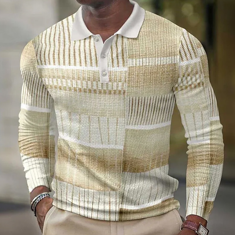 Men's Color Block Geometic Waffle Polo Shirts Long Sleeve Polo Shirts Collared Shirts Business Casual Business Wear to work Daily Wear Buttons Spring Fall Winter White Light Brown Brown