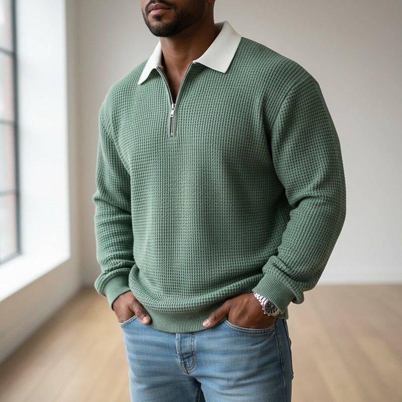 Men's Waffle Polo Shirts Textured Casual Street Long Sleeve Fashion Leisure Color Block Textured Zip Up Fall Spring Fall Fall Winter Regular Fit Purple Green Gray Light Blue Waffle Polo Shirts