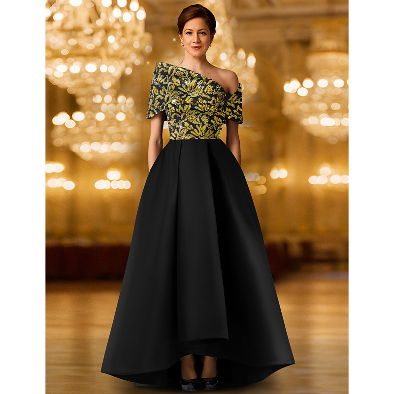 A-Line Floor Length Beaded Eembroidered Formal Dresses Mother of the Bride Dress Evening Gown Ball Gown Formal Dress Elegant Vintage Glittering Short Sleeve One Shoulder Wedding Formal Pocket Satin
