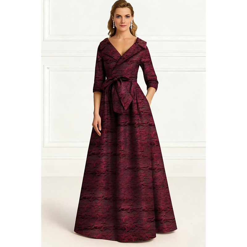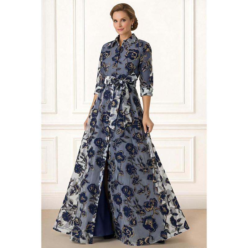 A-Line Floor Length Shirt Dress Wedding Guest Dress Formal Dresses Mother of the Bride Dress 3/4 Length Sleeve Shirt Collar Elegant Simple Formal Organza Jacquard with Bow(s)