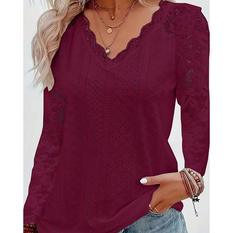Women's Blouse Lace Tops Plain Active Stylish Long Sleeve V Neck Regular Tops Daily Holiday Going out Lace Patchwork White Pink Wine Light Blue Summer Spring