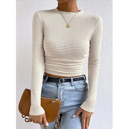 Per donna Blusa Tinta unica Elegante Casual Manica Lunga Girocollo Top Regolari Quotidiano Arricciato Nero Bianco Marrone Albicocca Primavera Autunno Inverno
