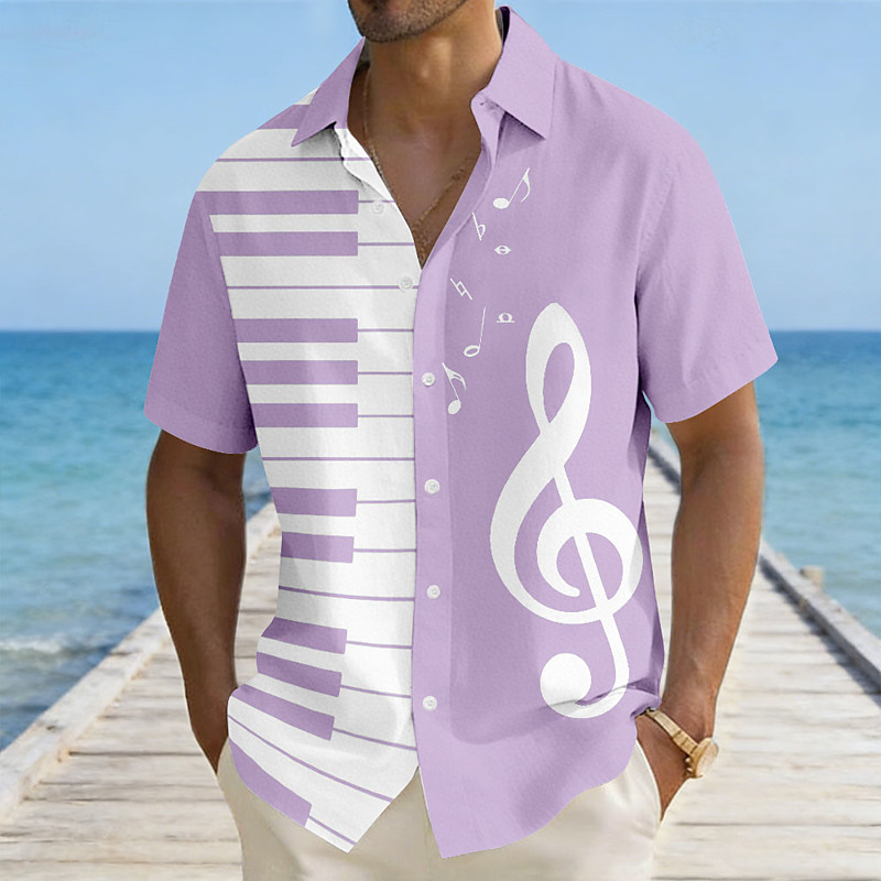 Men's Piano Musical Notes Shirt Summer Shirt Button Up Shirt Short Sleeve Vintage Retro Outdoor Vacation Music Festival Summer Turndown 3D Print Linen Like Shirt Blue Black Purple Green