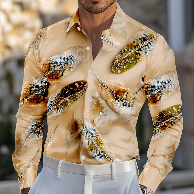 Mardi Gras Men's Feathers Dazzle color Carnival Shirt Satin Shirt Dress Shirt Long Sleeve Fashion Casual Party Holiday Summer Spring Turndown 3D Print Button Up Shirts Blue Yellow Purple