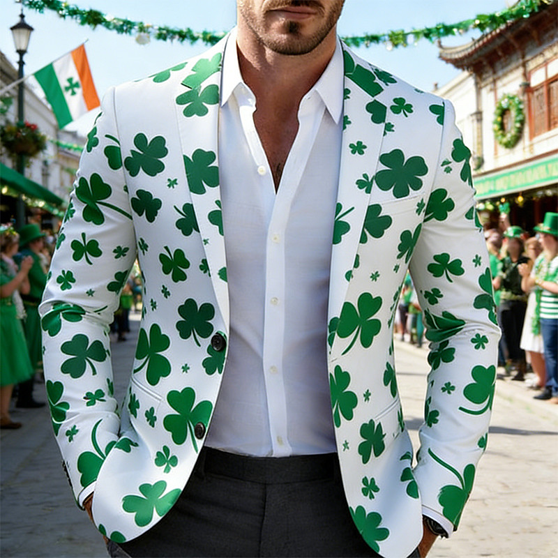 St. Patrick Men's Shamrock Blazer Comfortable Breathable Business Casual Daily Party Evening Wear Festival Pocket 3D Print Buttons Summer Fall Notch Long Sleeve White Dark Green Green