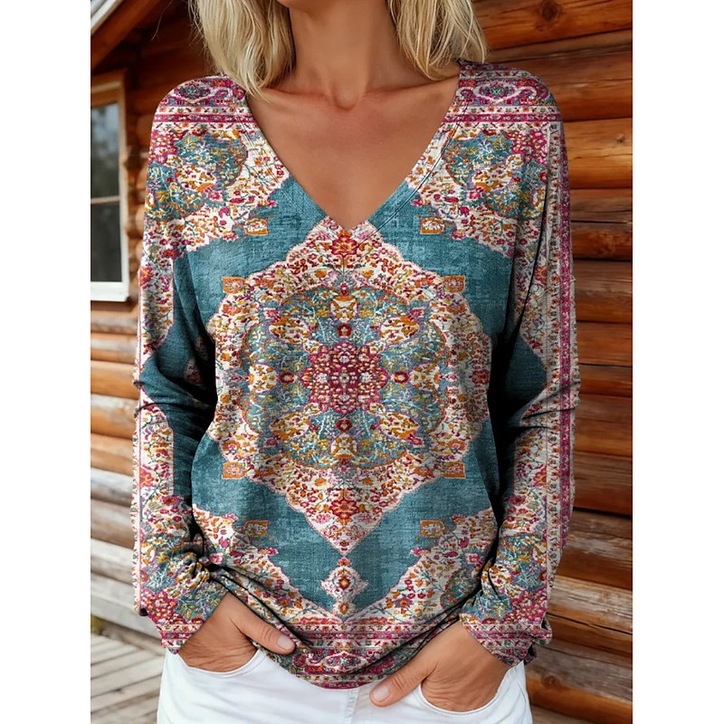 Women's T Shirt Graphic Plants Tribal Vintage Stylish Classic Long Sleeve V Neck Regular Tops Daily Print Blue Light Green Wine Navy Blue Fuchsia Spring Fall Winter