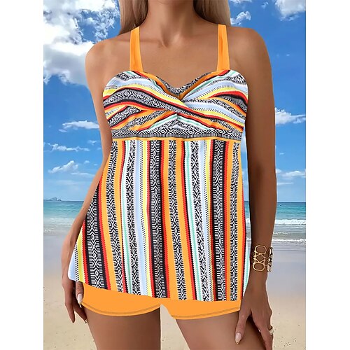 Costume da bagno Tankini da donna 2 pezzi con pantaloni corti controllo della pancia alta vita snellente senza schienale abbigliamento da spiaggia per le vacanze geometrico a righe scollo a V senza