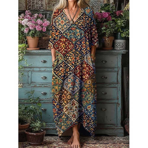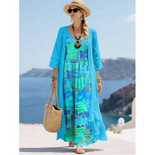Per donna Insieme del vestito Abito a trapezio Vacanza Casual Grafico Geometrico Stampato Abito maxi Manica 3/4 Scollo a V Quotidiano Blu Viola Arancione Estate Primavera Vestibilità comoda