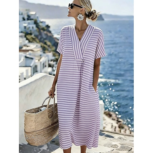 Per donna Abito Midi Vestito Casual Vestito Estivo Vacanza Casual Spiaggia Spiaggia Feste Vestibilità comoda Grafico A righe Manica Corta Scollo a V Blu Giallo Rosa Viola Estate Primavera
