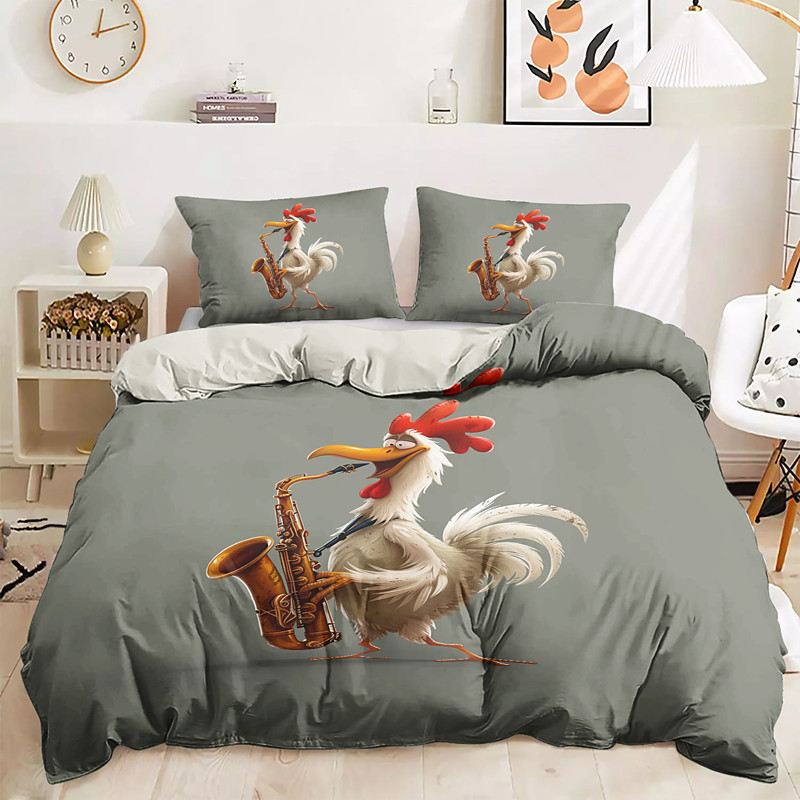 Duvet Cover Set with Funny Rooster Print, 100% Cotton, Soft and Breathable Fabric, Includes Duvet Cover and Pillowcases, Hypoallergenic and Skin-Friendly, Machine Washable, Durable, Comfortable