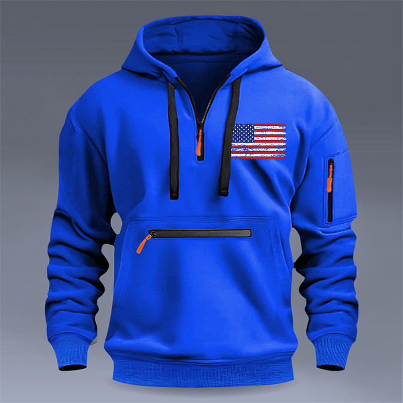 Men's Hoodie Pullover Quarter Zip Hoodie Blue Black Wine Navy Blue Camel Hooded American US Flag Pocket Print Daily Sports Outdoor Sports Streetwear Sportswear Casual Fall Winter Clothing Apparel