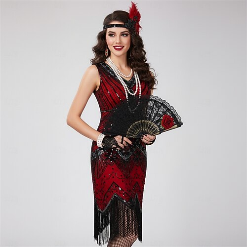 Retrò Vintage Anni Ruggenti Anni 1920 Lunghezza al ginocchio Abito Flapper Abiti Senza maniche Il grande Gatsby Invitato al matrimonio Paillettes Frangia con nappe Scollo a V Costume Per donna Natale