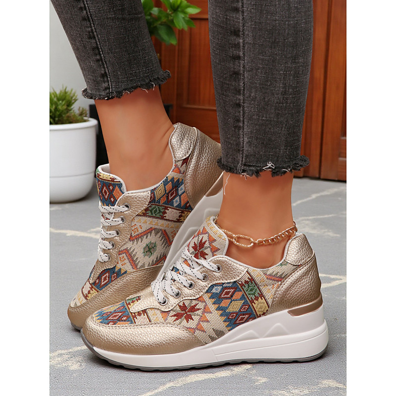 Women's Gold Wedge Sneakers – Lace-Up Platform Trainers with Ethnic Print for Casual Streetwear and Weekend Travel