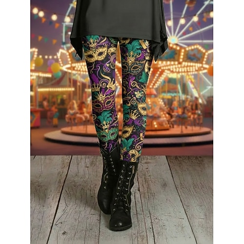 Karnevals-Leggings für Damen, bequeme Leggings im Vintage-Ethno-Stil, lange Hose mit hohem Bund, Grafikprint, bequem, dehnbar, lässig, für Alltag und Urlaub, dunkelviolett, gelb, hellviolett