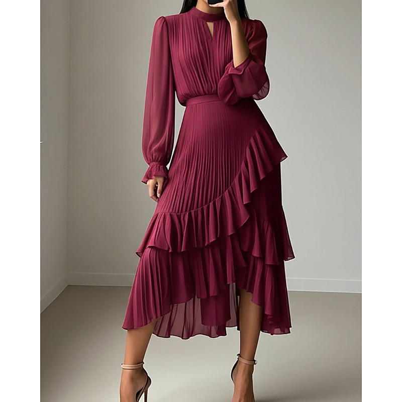 Women's Midi Dress Tiered Dress Elegant Vintage Date Regular Fit Flower Long Sleeve Crew Neck Blue Green Grey Summer Spring Fall Autumn