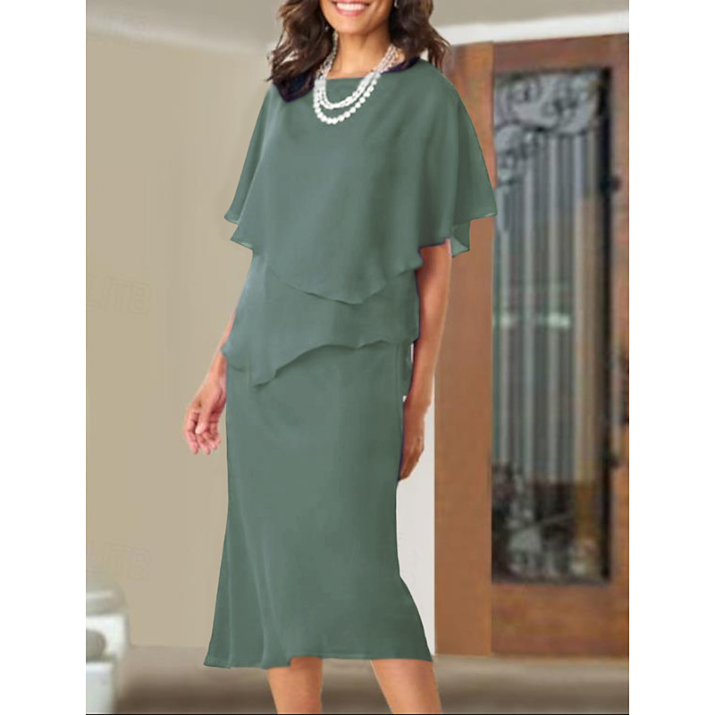 Two Piece Sheath Column Knee Length Wedding Guest Dress Mother of the Bride Dress 3/4 Length Sleeve Jewel Neck Elegant Wedding Guest Church Chiffon Satin Lace Short Jacket Dresses with Appliques