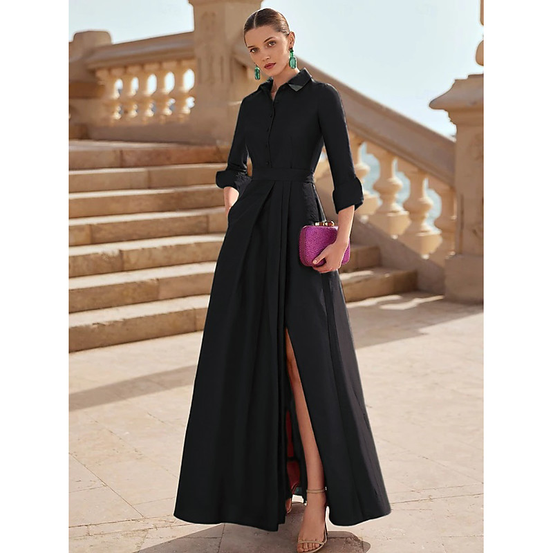 A-Line Floor Length Shirt Dress Wedding Guest Dress Formal Dresses Mother of the Bride Dress 3/4 Length Sleeve Shirt Collar Elegant Wedding Formal Taffeta Stretch Satin with Slit