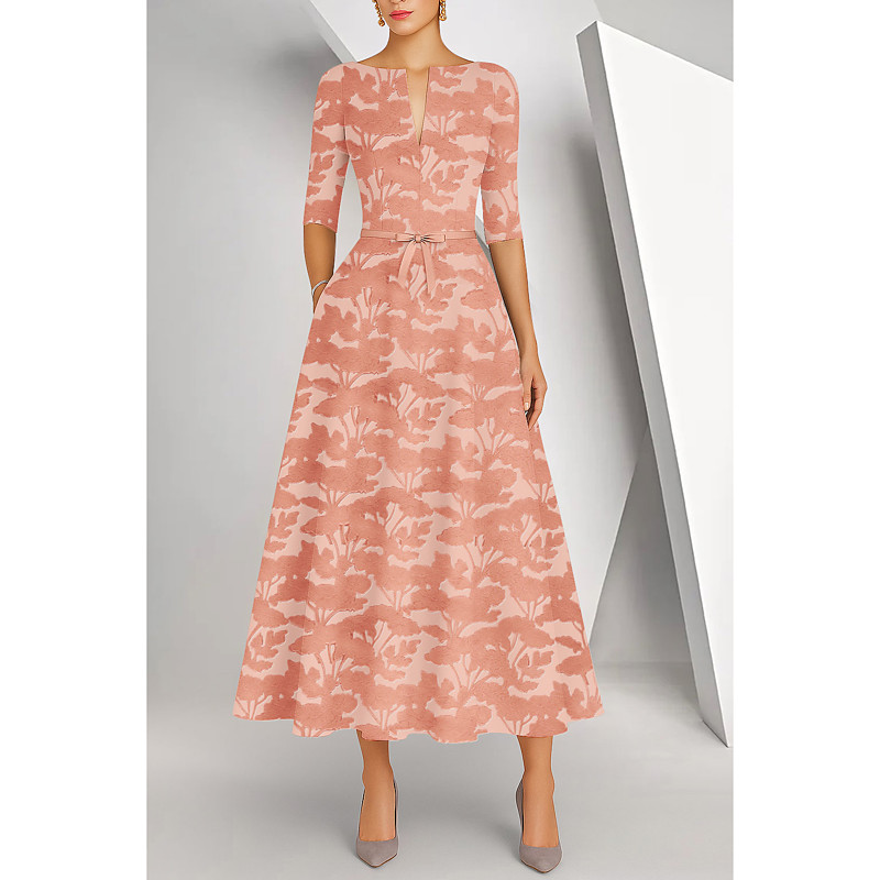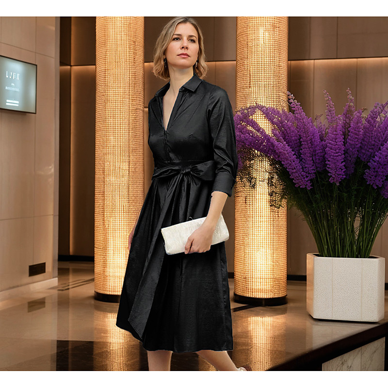 A-Line Tea Length Shirt Dress Formal Dresses Evening Gown Mother of the Bride Dress 3/4 Length Sleeve Shirt Collar Elegant Vintage Formal Jacquard with Sash / Ribbon Bow(s) Flower