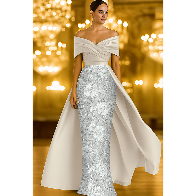 A-Line Floor Length Beaded Eembroidered Formal Dresses Mother of the Bride Dress Evening Gown Ball Gown with Overskirt Formal Dress Elegant Silky Short Sleeve Off Shoulder Wedding Formal Satin Lace