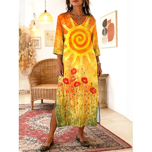 Per donna Abito maxi Abito Boho Abito a Tubino Vestito Estivo Abito da Spiaggia Bohemien Vacanza Etnico Spiaggia Ferie Data Vestibilità comoda Floreale Grafico Astratto Manica 3/4 Scollo a V Giallo