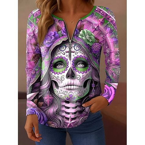 Damen T-Shirt Totenköpfe Grafik Vintage Stilvoll Lässig Langarm Rundhals Reguläre Oberteile Daily Weekend Zipper Druck Gelb Pink Blau Grau Herbst Winter