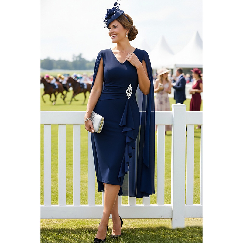 Sheath Column Knee Length Derby Dress Mother of the Bride Dress Sleeveless V Neck Elegant Vintage Minimalist Kentucky Derby Chiffon Wrap Included with Crystal Brooch Solid Color