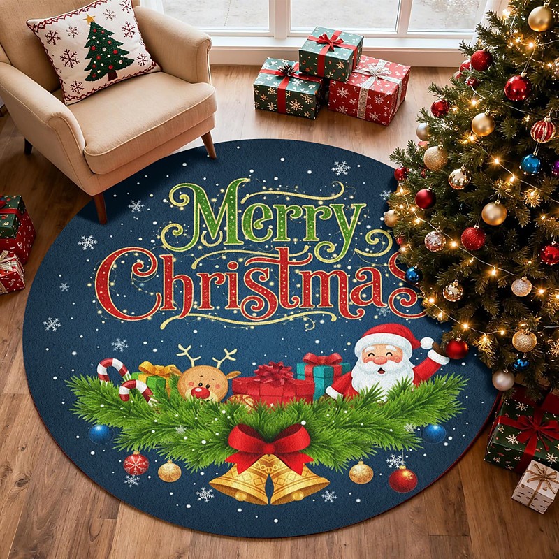 Merry Christmas Round Area Rug For Living Room And Bedroom, Faux Cashmere Xmas Santa And Reindeer Holiday Carpet, Soft Non-Slip Machine Washable Rug, Festive Decorative Floor Mat, 4ft
