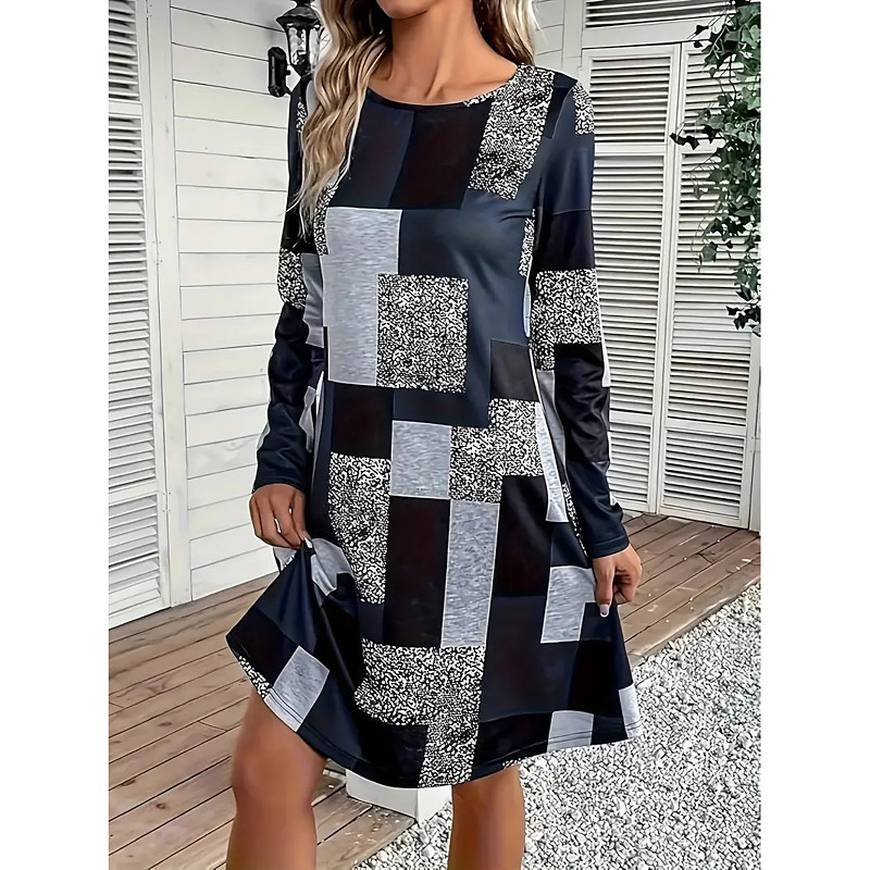 Women's Mini Dress Sheath Dress A Line Dress Fit And Flare Dress Party Casual Boho Party Wedding Guest Daily Regular Fit Graphic Geometric Plaid Long Sleeve Crew Neck Blue Purple Green Gray Spring