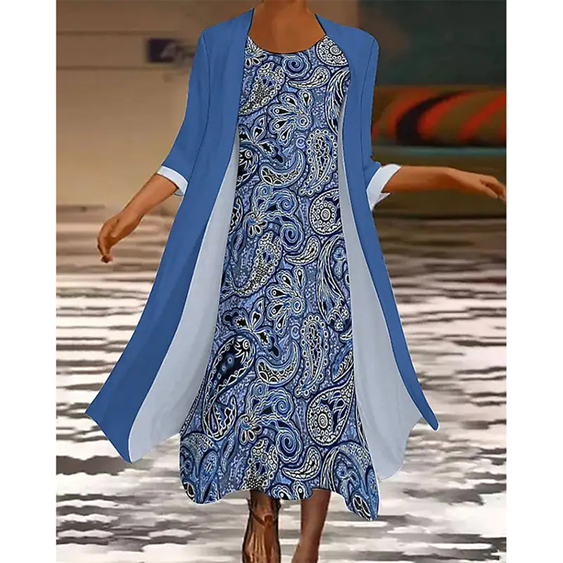 Women's Dress Set Maxi Dress A Line Dress Casual Graphic Tribal Print Midi Dress 3/4 Length Sleeve Crew Neck Daily Blue Purple Green Summer Spring Regular Fit