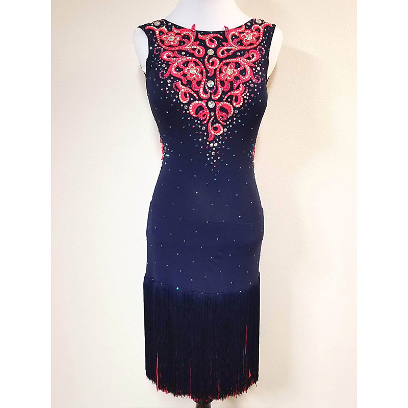 Women's Latin Dance Dress Navy Blue Rhinestone Fringe Dress with Red Embroidery Rumba Cha Cha Samba Competition Costume