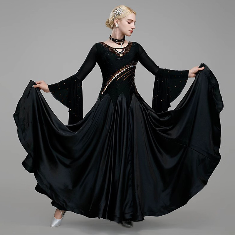 Women's Ballroom Dance Dress Long Sleeve Mesh Waltz Tango Latin Competition Performance Gown Elegant Black Flowing Skirt with Sheer Bodice Design