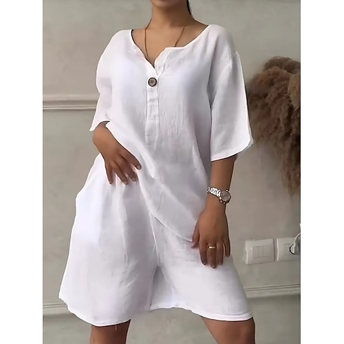 Completo da donna in finto cotone e lino, completo con pantaloncini, maniche a 3/4, scollo a V, tinta unita, moda streetwear, casual, quotidiano, per esterni, blu, bianco, rosa, estivo, vestibilità