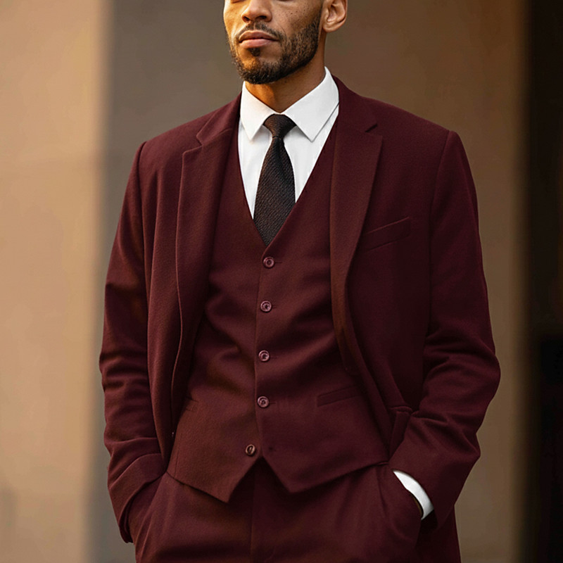 Men's Business Casual Tweed Suits Notch Lapel Black Burgundy Daily Business Solid Colored Tailored Fit 3 Piece Single Breasted Two-buttons