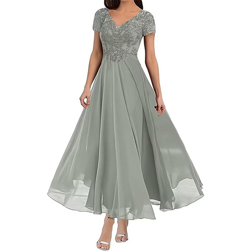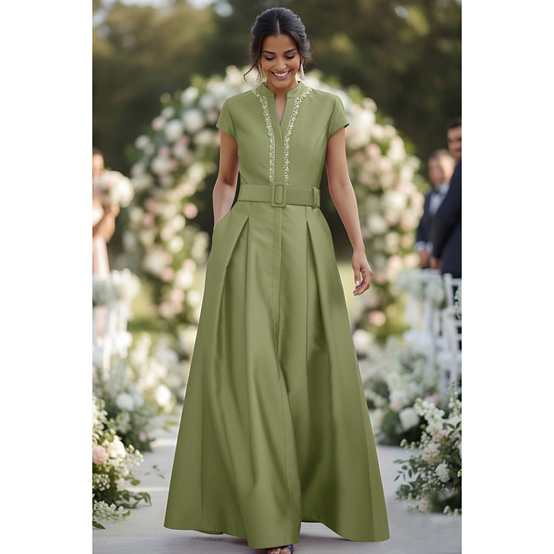 A-Line Floor Length Party Dress Cocktail Dress Wedding Guest Dress Mother of the Bride Dress Short Sleeve V Neck Elegant Wedding Guest with Solid Color