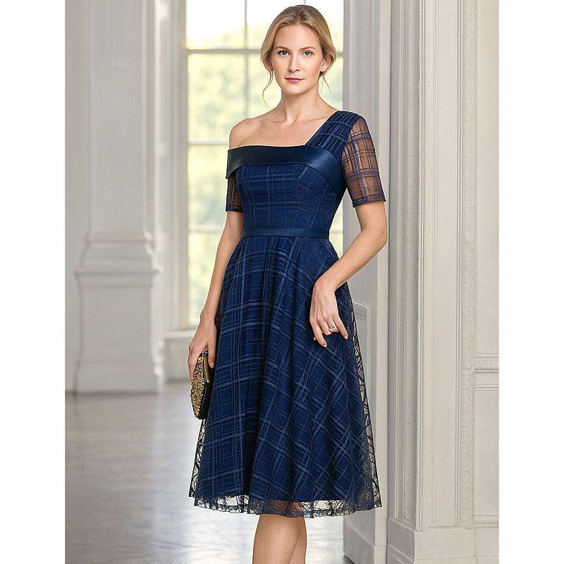 A-Line Tea Length Party Dress Cocktail Dress Wedding Guest Dress Mother of the Bride Dress Short Sleeve Off Shoulder Elegant Vintage Party with Pleats