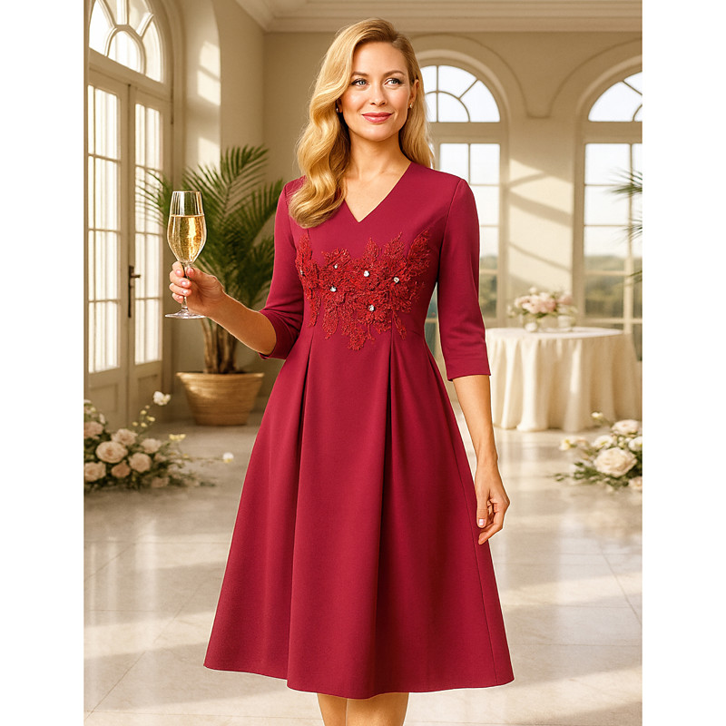 A-Line Tea Length Party Dress Cocktail Dress Wedding Guest Dress Mother of the Bride Dress Short Sleeve V Neck Elegant Formal Wedding Guest Chiffon Lace with Appliques Crystal Brooch