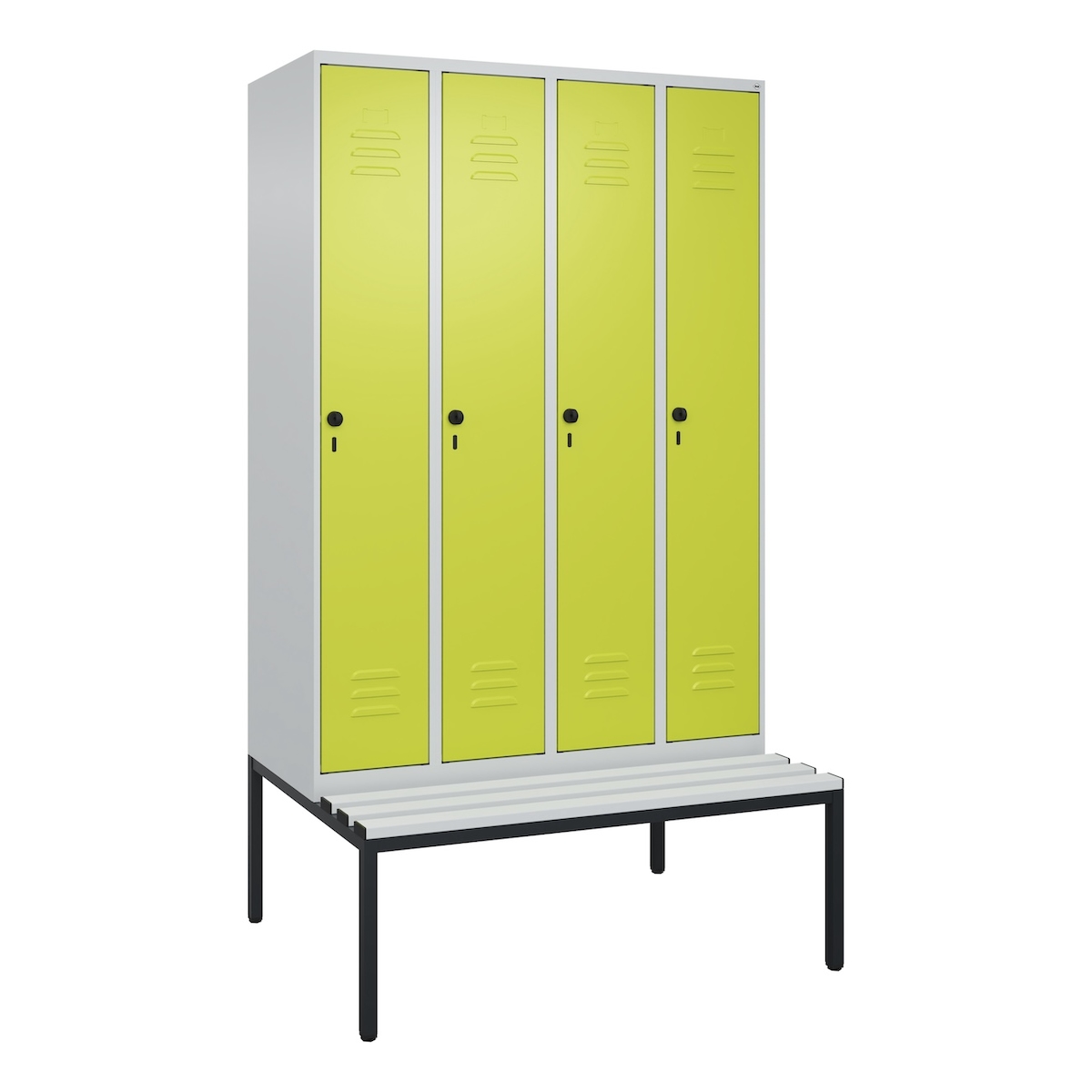 C+P Spind Classic PLUS, Kunststoff untergebaute Sitzbank, 4 Abteile, HxBxT 212x120x82cm, Sicherheitsdrehriegel, Hellgrau/Clowngrün von PROREGAL