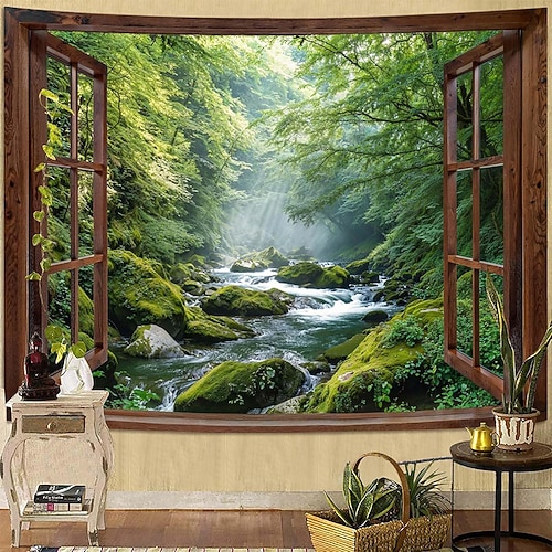 Arazzo con vista della finestra in 3D, paesaggio con fiume e foresta, alberi verdi, natura, arazzo da parete per soggiorno, arredamento per la casa, sfondo per poster in tessuto.