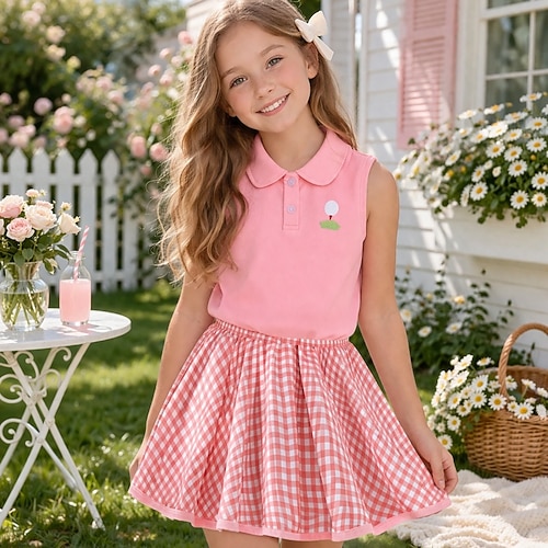 2 Pezzi Bambini Ragazze Plaid Abiti eleganti Impostato Senza Maniche Attivo All'aperto Dai 4 anni in su Estate Rosa