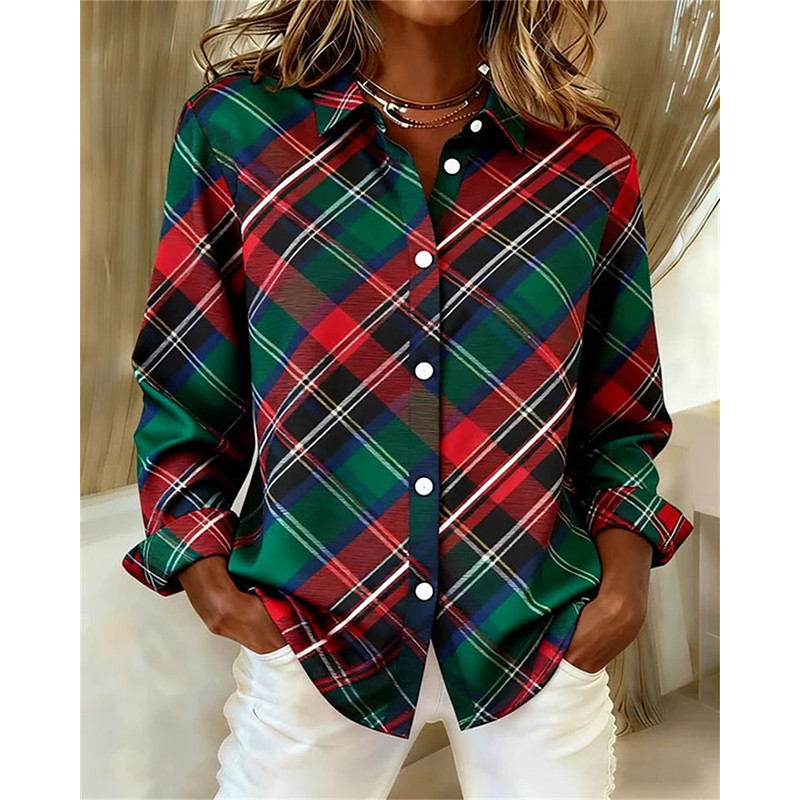 Christmas Women's Shirt Blouse Plaid Santa Claus Christmas Tree Elegant Vintage Party Long Sleeve Shirt Collar Regular Tops Daily Work Holiday Ruched Patchwork Buttons Blue Red Orange Green Beige