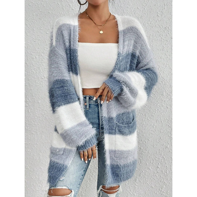 Women's Sweater Cardigan Elegant Fashion Streetwear Striped Open Front Pocket Knitted Long Sleeve Long Tops Knit Outdoor Daily Weekend Light Blue Fall Winter