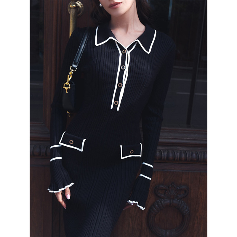 Women's Sweater Sweater Dress Casual Soft Pure Color Ribbed Shirt Collar Knitted Long Sleeve Long Tops Knit Outdoor Daily Weekend Black Beige Spring Fall