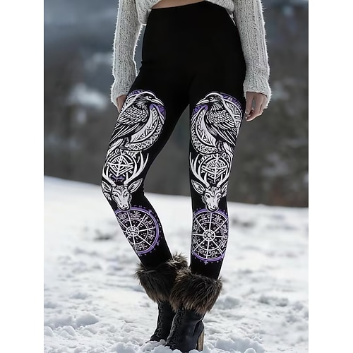 Damen-Leggings im Wikinger-Stil, kuschelig, für Urlaub, Vintage-Look, Ethno-Stil, lange Länge, hoher Bund, Tiermuster, bequem, dehnbar, für Freizeit, Alltag, lila, Frühling, Herbst, Winter, schmale