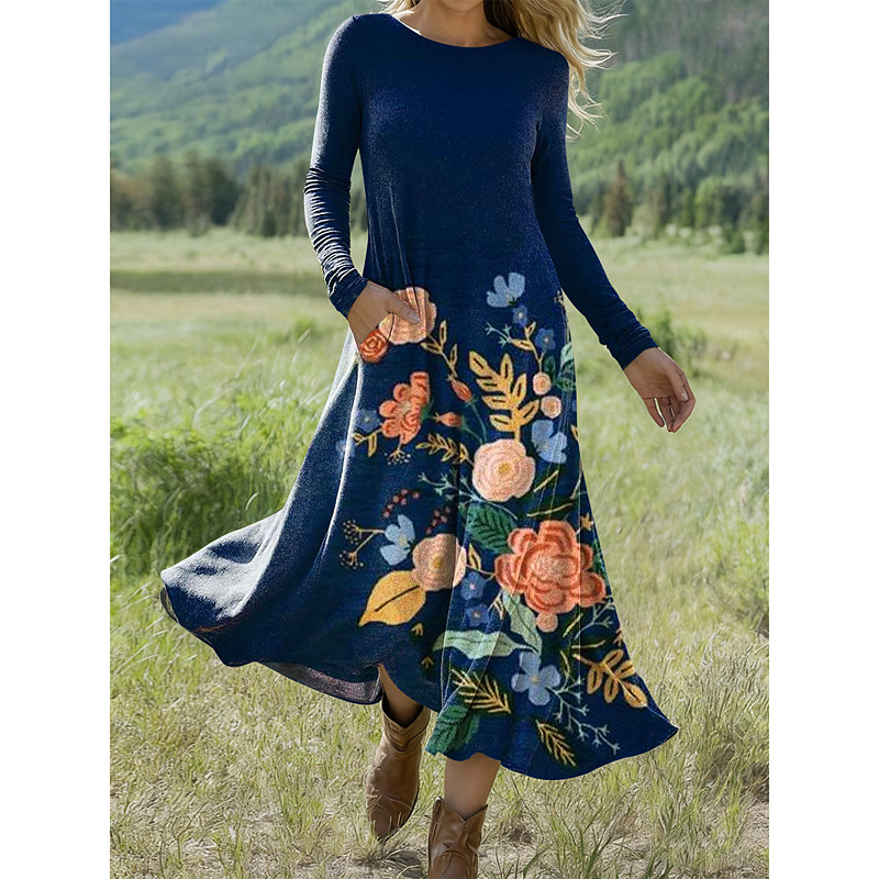 Women's Midi Dress A Line Dress Casual Dress Winter Dress Swing Dress Fashion Streetwear Mature Formal Outdoor Vacation Regular Fit Floral Long Sleeve Crew Neck Black Navy Blue Royal Blue Blue Spring