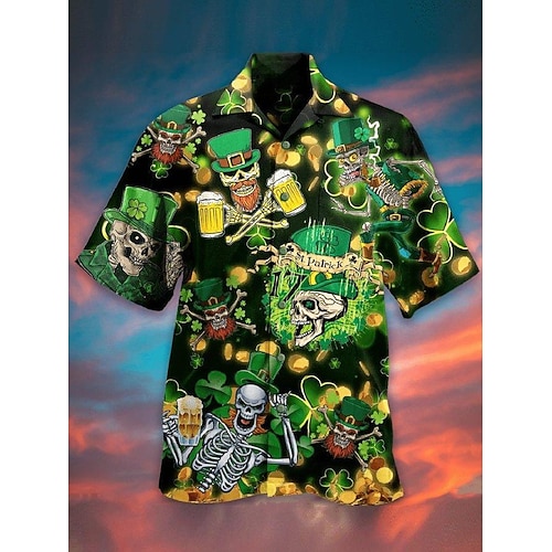 camicia da uomo per il giorno di San Patrizio camicia hawaiana estiva con teschio birra st. giorno di san patrizio trifoglio couverture nero verde casual vacanza manica corta abbottonatura stampa
