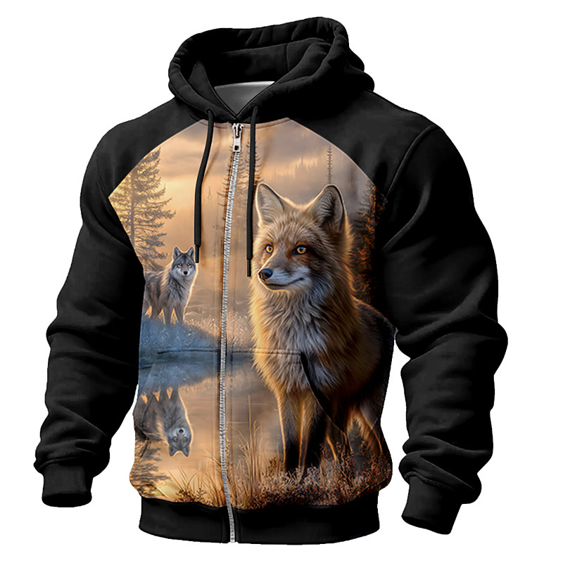 Men Zip Up Hoodie Realistic Fox Graphic Wildlife Sunset Forest Nature Reflection Hooded Jacket Black Clothing Apparel S M L XL XXL XXXL