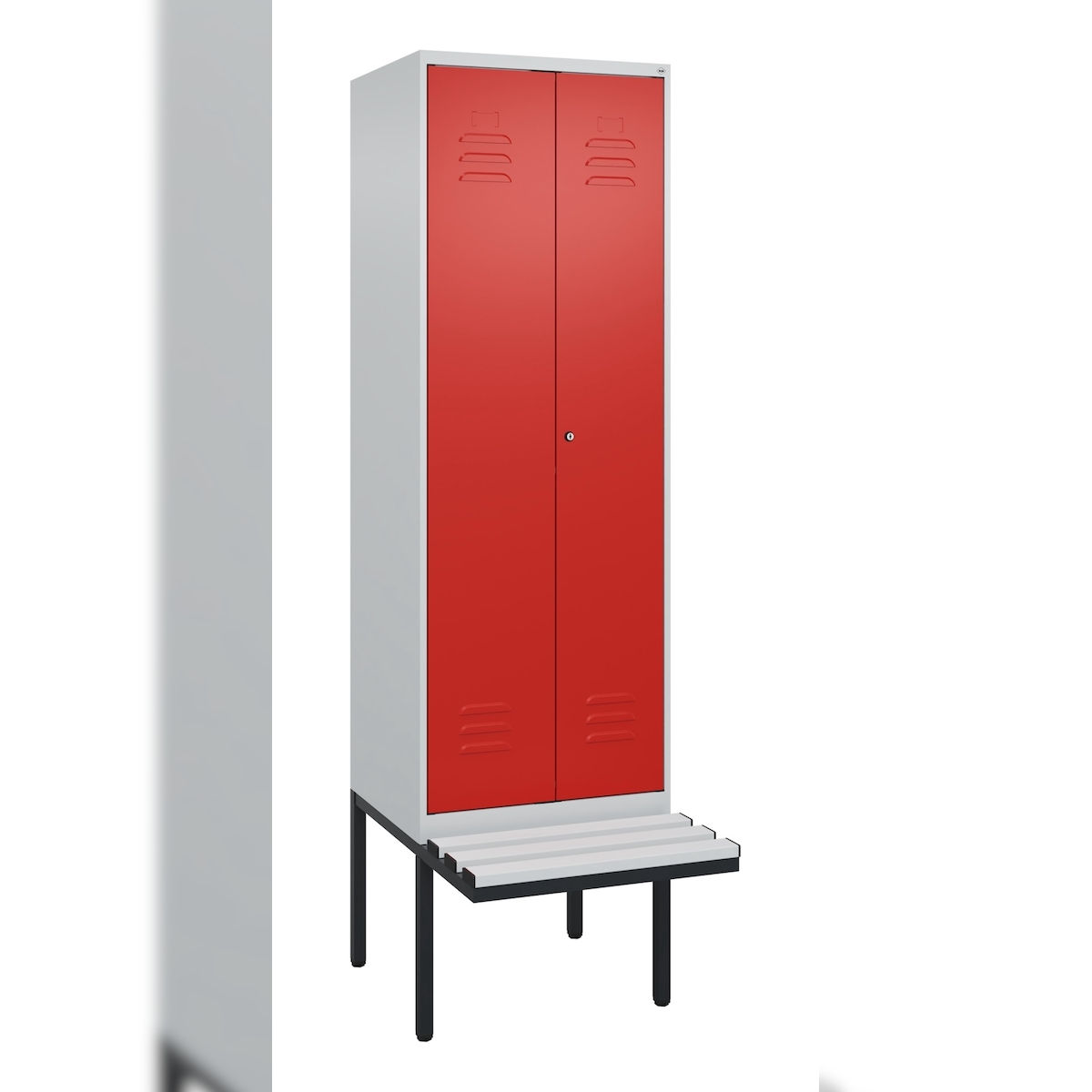 C+P Z-Spind Classic PLUS, schwebender Sitzbank aus Buche 2 Abteile, HxBxT 212x30x82cm, Sicherheitsdrehriegel, Hellgrau/Rot von PROREGAL